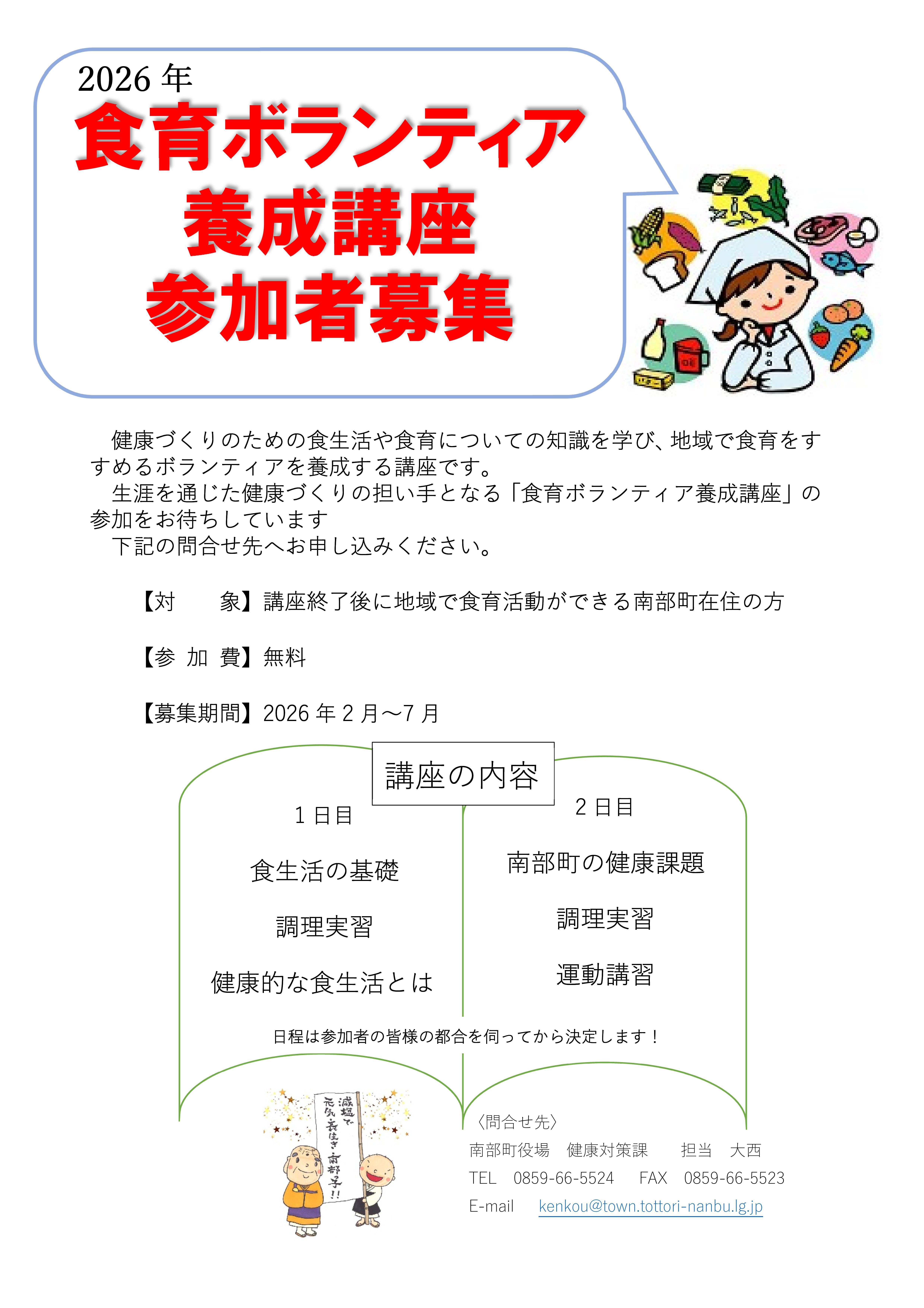南部町では「食」を通して健康づくりを推進するための食育ボランティア養成講座を実施します。「食」に関する知識を習得し、自ら「食」について考え、健全な食生活を身に付けることができる内容になっています。