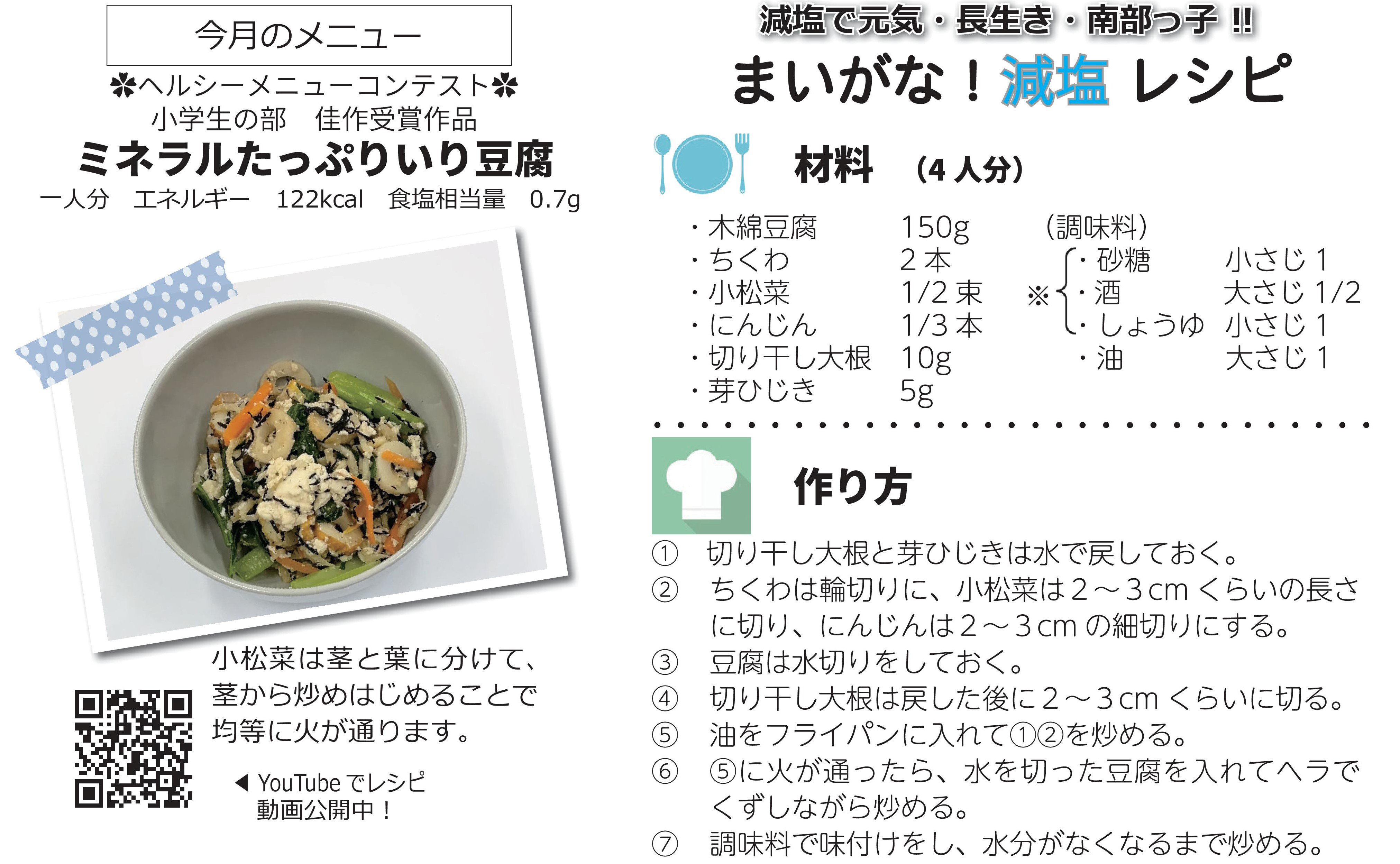 ホーム > 健康対策課 > 広報なんぶ レシピ集 > 2025年度レシピ > ミネラルたっぷり炒り豆腐