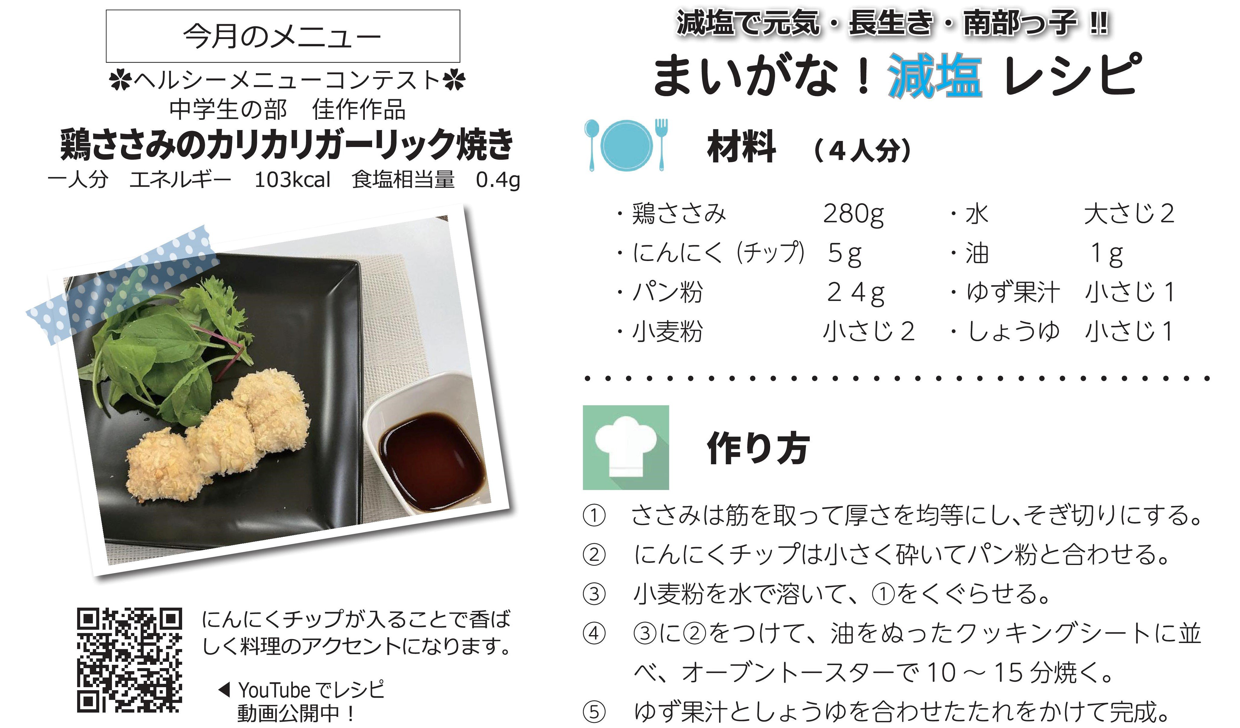 ホーム > 健康対策課 > 広報なんぶ レシピ集 > 2025年度レシピ > 鶏ささみのカリカリガーリック焼き