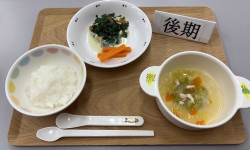 ◇5倍かゆ ◇みそ汁 (昆布だし、みそ、白菜、大根、にんじん、玉ねぎ、ささみ) ◇ほうれん草とささみ煮(みそ豆乳) ◇スティック野菜 |