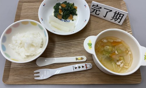 ◇軟飯 ◇みそ汁 (昆布だし、みそ、白菜、大根、にんじん、玉ねぎ、ささみ) ◇ほうれん草とささみ煮(みそ豆乳) ◇スティック野菜 |