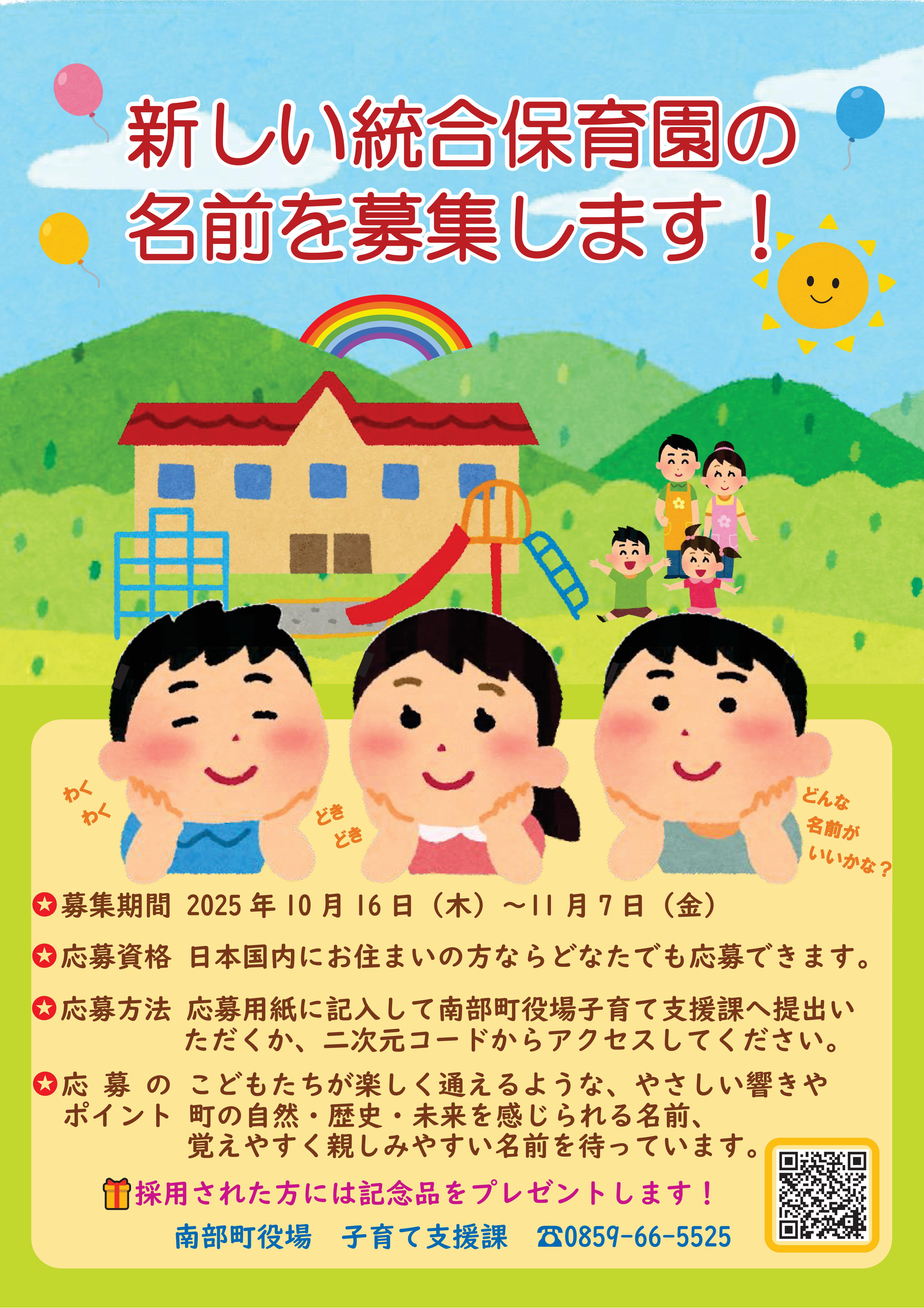 令和8年秋、南部町の公立保育園である「つくし保育園」と「さくら保育園」を統合し、新たに公私連携型の私立保育園を開園する予定です。南部町の未来を担うこどもたちが健やかに育ち、地域の方からも親しまれ、愛着を持っていただけるような園となることを願い、新しい統合保育園の名前を募集します。