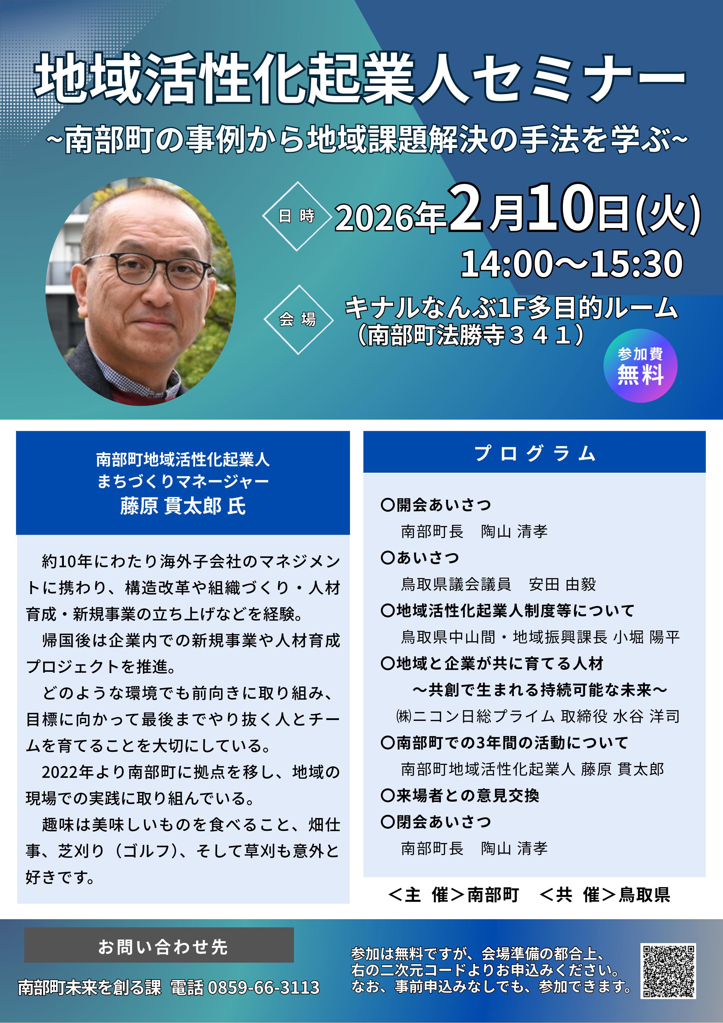 地域活性化起業人として、南部町で活躍する藤原 貫太郎(ふじわら かんたろう)氏によるセミナーを行います。 ぜひご参加ください!