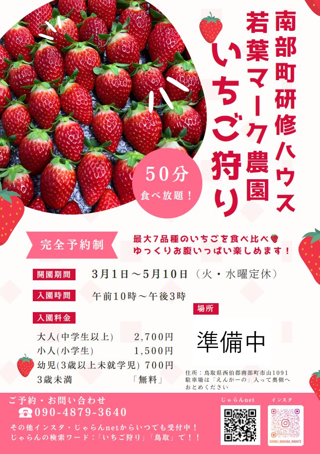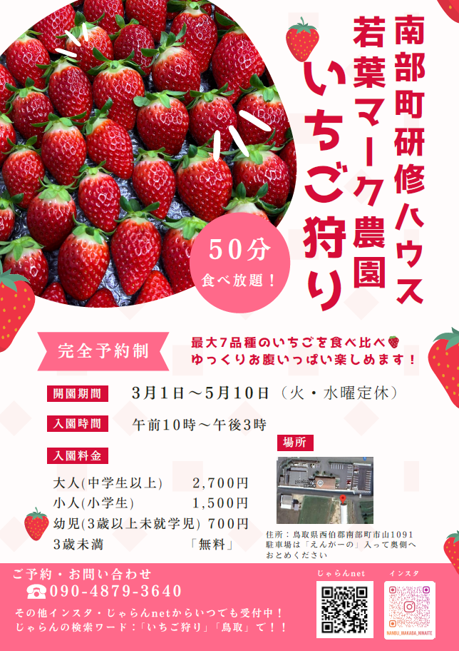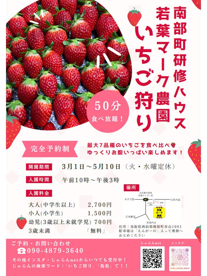 南部町研修ハウス【若葉マーク農園】で、3月から5月上旬までいちご研修生によるいちご狩りが行われることとなりました。