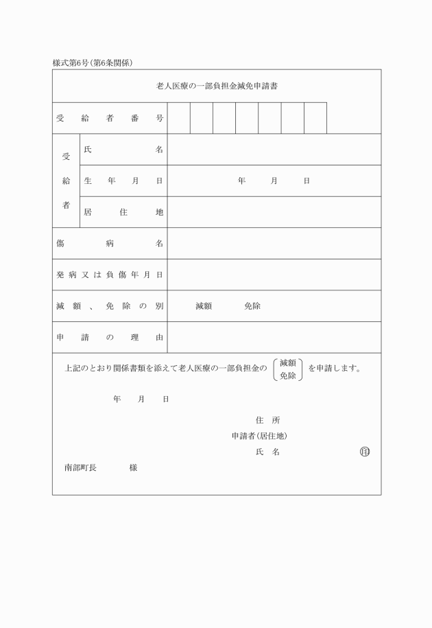 第6条 減免証明書等交付簿は、施行規則第20条第3項の規定により老人医療の一部負担金減免申請書(様式第6号)に基づき老人医療の一部負担金減免証明書(様式第7号)を交付するとき、施行規則第45条第4項の規定により老人医療の特定疾病認定申請書(様式第5号の2。以下「特定疾病認定申請書」という。)に基づき老人保健特定疾病療養受療証(以下「特定疾病受療証」という。)を交付するとき、又は施行規則第50条第4項の規定により限度額適用・標準負担額減額認定申請書(様式第5号の3)に基づき老人医療の限度額適用・標準負担額減額認定証(様式第5号の4)を交付するときにそれぞれ整理するものとする。