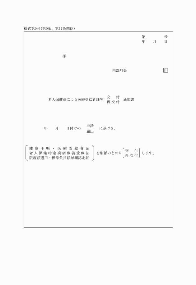 (2) 医療受給者証等を作成し、老人保健法による医療受給者証等再交付通知書(様式第9号)に添えて再交付すること。