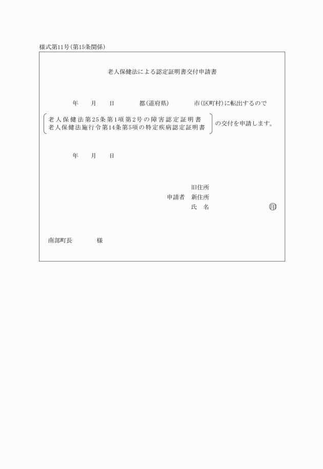 第11条 老人保健法による医療の受給資格変更届書(様式第8号。以下「受給資格変更届書」という。)により施行規則第6条に規定する氏名変更の届出、施行規則第7条に規定する居住地の変更の届出又は施行規則第8条の2第1項に規定する法第25条第7項の規定の適用を受ける旨の届出若しくは継続居住地変更の届出を受けたときは、次により処理するものとする。