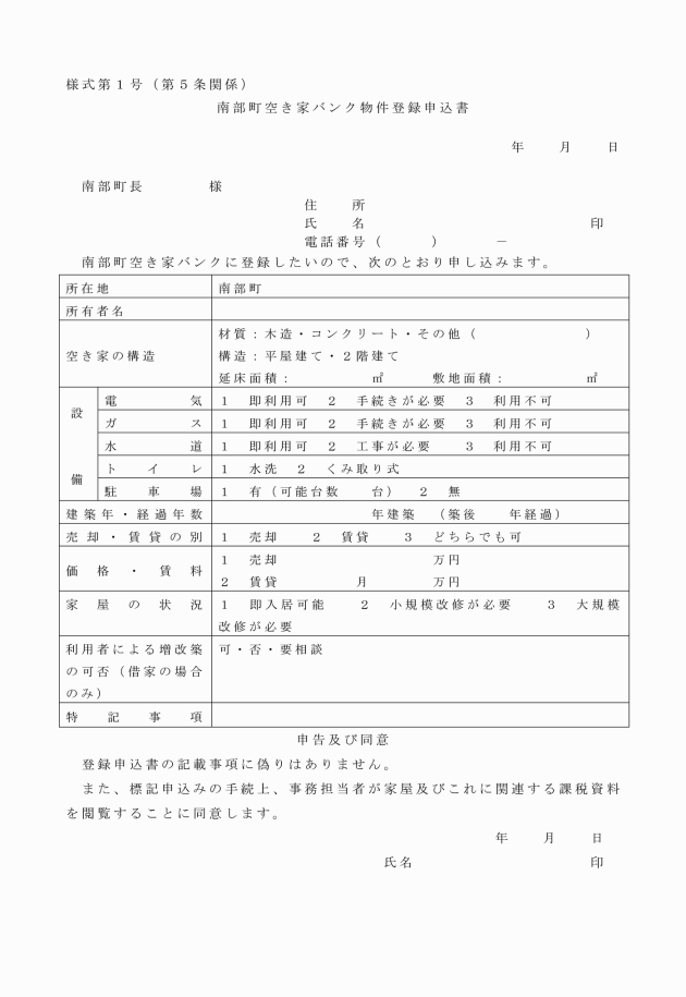 第5条 空き家バンクに空き家等の情報を登録しようとする所有者等は、南部町空き家バンク物件登録申込書(様式第1号)を町長に提出しなければならない。